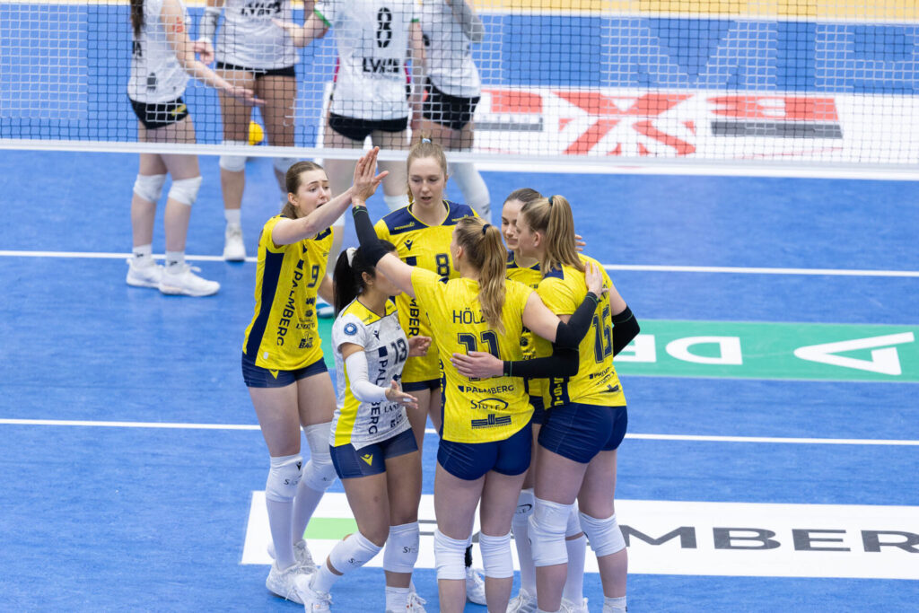 Für den SSC Palmberg Schwerin bedeutete die Begegnung mit dem USC Münster am Samstagabend bereits das zehnte Spiel innerhalb von etwas mehr als einem Monat – doch auf dem Spielfeld war den Damen die hohe Belastung kaum anzumerken. Angriffsstark und mit druckvollen Aufschlägen gingen die Gastgeberinnen im ersten Durchgang ans Werk, doch auch das junge Team aus Münster punktete mit guten Aufschlägen zum Beispiel zum 11:11. Elles Dambrink brachte den Tabellenzweiten aus Schwerin mit einem wuchtigen Angriff zum 18:15 in Führung. Mit 25:19 ging der erste Satz mit einem guten Polster an den Favoriten aus Schwerin.