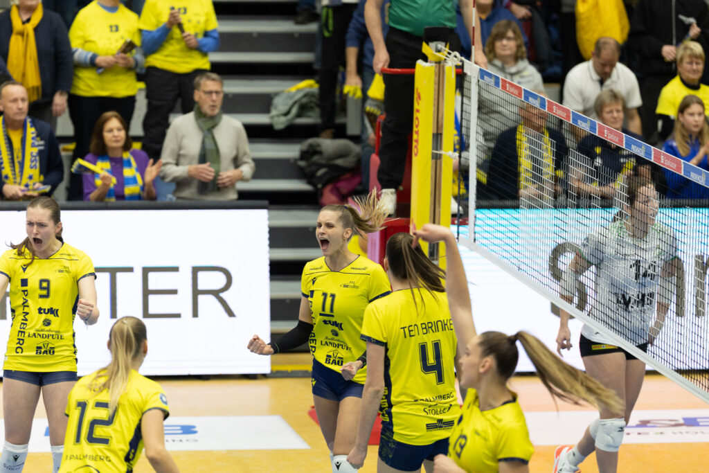 Der SSC Palmberg Schwerin zeigte sich vor heimischer Kulisse eindrucksvoll und mit voller Punkteausbeute. Angetrieben von einer lautstarken PALMBERG ARENA setzte sich der SSC nach einem umkämpften ersten Satz zunehmend durch und steigerte sich in Aufschlag, Abwehr und Angriff kontinuierlich. Gegen den USC Münster behielten die Schwerinerinnen in den entscheidenden Momenten die Nerven und feierten am Ende einen verdienten 3:0-Heimerfolg. Die Palmberg Arena präsentierte sich von Beginn an als lautstarke Kulisse, denn den Fans war bewusst, dass ihre Mannschaft nach zwei Auswärtsniederlagen jede Unterstützung benötigen würde. Beide Teams eröffneten die Partie mit hoher Aggressivität im Aufschlag und im Block. Schwerin profitierte zunächst von einigen Angriffsfehlern der Gäste und konnte sich so beim 7:4 erstmals leicht absetzen. Allerdings zeigte sich auch der SSC zu Beginn noch fehleranfällig, sodass Münster beim 8:11 die Führung übernahm. Zwei Punkte später sah sich Schwerins Trainerteam zur ersten Auszeit gezwungen, da der USC bei stabiler Annahme sein variables Angriffsspiel erfolgreich aufziehen konnte. Doch die Gastgeberinnen ließen sich davon nicht entmutigen, kämpften sich Punkt für Punkt zurück und steigerten insbesondere ihre Abwehrleistung. Der Lohn war der Anschluss zum 15:16. Nach dem Ausgleich zum 18:18 setzte sich Münster erneut auf 18:20 ab, doch Schwerin glich abermals aus. Dank Anna Artyshuk und Anne Hölzig blieb der SSC im Spiel, beide punkteten im richtigen Moment im Angriff. Kapitänin Hölzig war es schließlich auch, die mit ihrem Angriff die Führung zum 23:22 besorgte und Münsters Trainer Matthias Pack zu einer Auszeit zwang. Schwerin blieb in der Schlussphase konzentriert und nervenstark und entschied den hart umkämpften ersten Satz schließlich mit 25:22 für sich. Schwerin erwischte im zweiten Durchgang einen Start nach Maß. Mia Kirchhoff punktete früh im Angriff, während Anne Hölzig in der Abwehr nahezu goldrichtig stand und insbesondere Münsters Diagonalangreiferin Ford immer wieder zur Verzweiflung brachte. Hölzigs Aufschlagserie führte die Gastgeberinnen bis zur 6:0-Führung und überstand sowohl eine frühe Auszeit der Gäste als auch die Einwechslung von Malm für Kömmling. Mit zunehmender Spieldauer erhöhten Schwerins Angreiferinnen ihre Durchschlagskraft deutlich. Auch die kurzen Tip-Bälle, die Münster im ersten Satz noch erfolgreich entschärfen konnte, fanden nun immer häufiger den Weg auf den Hallenboden. Vor allem Jet Kok kam zunehmend auf Betriebstemperatur und wurde von Zuspielerin Vedrana Jaksetic immer wieder klug in Szene gesetzt. Beim Stand von 15:7 griff Münster erneut zur Auszeit. In dieser Phase schien bei Schwerin nahezu alles zu gelingen: Selbst schwierige Bälle wurden erfolgreich verwertet, während Münster weiterhin einem Sieben-Punkte-Rückstand hinterherlief. Auch der Doppelwechsel mit Liu und Schultze beim Stand von 18:10 brachte keine Wende mehr. Der SSC blieb konzentriert, ließ sich nicht aus dem Rhythmus bringen und spielte den Satz souverän zum deutlichen 25:16-Erfolg zu Ende. Die Gastgeberinnen nahmen den Schwung aus dem zweiten Durchgang mit in den dritten Satz und ließen sich von der erneut stimmungsvollen PALMBERG ARENA tragen. Vor allem eine starke Aufschlagserie von Marije ten Brinke sorgte früh für klare Verhältnisse und brachte den SSC zeitig in Führung. Münster sah sich schnell mit einem Fünf-Punkte-Rückstand konfrontiert und hatte der hohen Angriffsquote der Schwerinerinnen zunächst wenig entgegenzusetzen. Zur Satzmitte jedoch leitete eine druckvolle Aufschlagserie von Zuspielerin Jordan, kombiniert mit erfolgreichen Angriffen von Strothoff, eine Aufholjagd der Gäste ein. Münster verkürzte auf 15:12 und brachte neuen Schwung in die Partie. Schwerin reagierte mit dem Doppelwechsel und konnte den Lauf zunächst unterbrechen, doch der USC witterte seine Chance und kämpfte sich weiter heran. Der zuvor sieben Punkte betragende Rückstand schmolz bis zum 18:18-Ausgleich. Insbesondere der hohe Aufschlagdruck der Gäste bereitete Schwerin in dieser Phase Probleme, sodass es auf Augenhöhe in die Crunchtime ging. Nach einem wuchtigen Angriff von Jet Kok und einem Ass von Mia Kirchhoff hatte der SSC wieder die Nase vorn und erspielte sich den ersten Matchball. Mit einem Block von Vedrana Jaksetic zum 25:22 machte Schwerin schließlich den 3:0-Heimerfolg perfekt. Starting Six Münster: Strothoff – Seybering – Ford – Kömmling – Spöler – Jordan – Molenaar Starting Six SSC Palmberg Schwerin: Reesink – Jaksetic – Kok – Hölzig – Kirchhoff – Stuut – ten Brinke